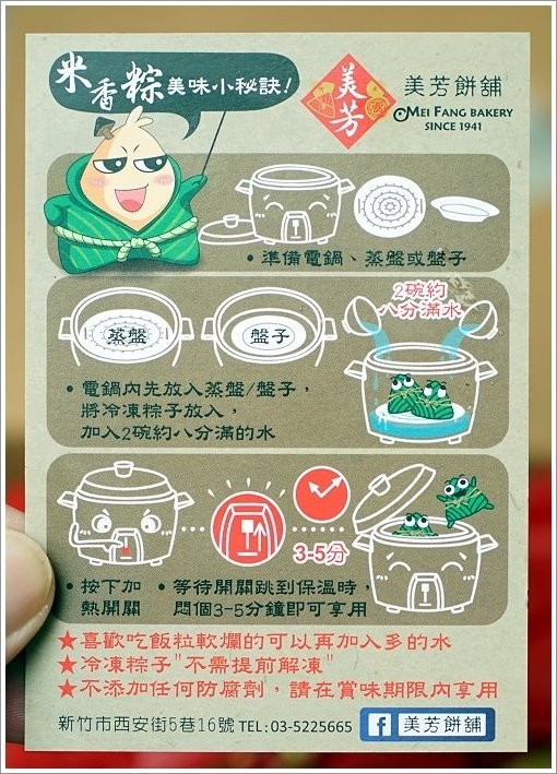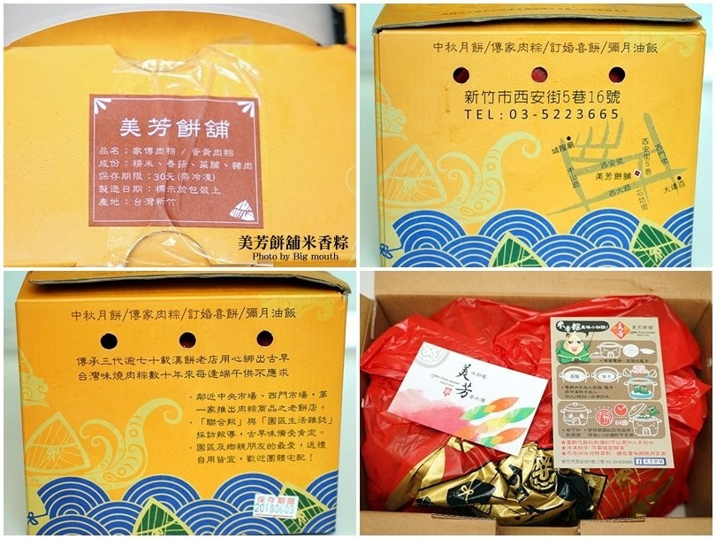 ▼盒側還有「美芳餅舖」的介紹,讓人對他們家有初步的了解與認識!打開一看,裡頭的粽子還有另外用袋子盛裝,另外還有附上名片、加熱方式,感覺相當用心!