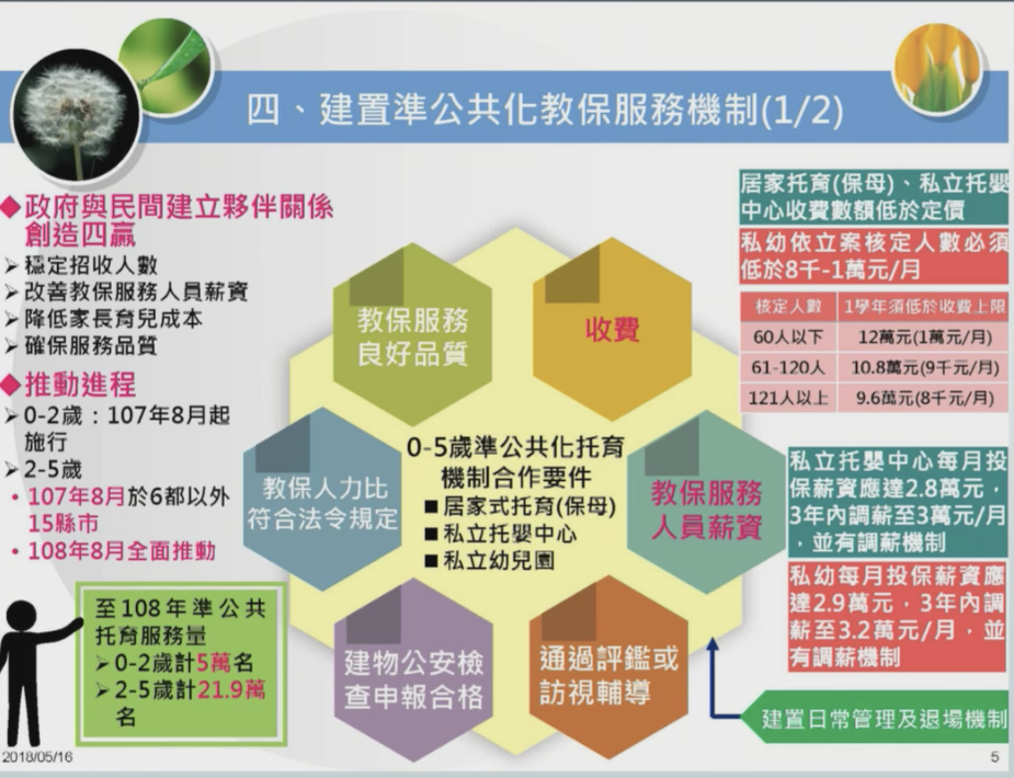 1) 提高教保服務公共化比率。將目前公共化幼兒園的比率從 30% 逐年提高到 40%。