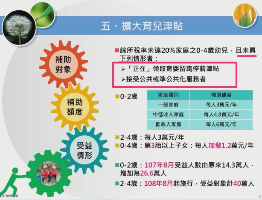 107 年 8 月起:擴大到 0 至 4 歲嬰幼兒,不限定父母就業、在家自行照顧嬰幼兒的父母(沒有領取「育嬰留職停薪津貼」者)或沒有參與準公共化的私立幼兒園家長,綜所稅率低於 20% 的家長,每名幼兒每月 2,500 元,每年 3 萬元。