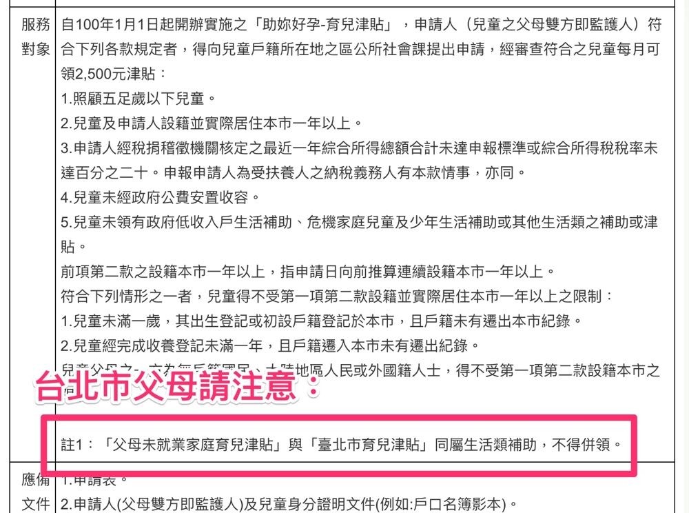 要注意的是此次中央的育兒津貼補助是將原先「父母未就業家庭育兒津貼」的內容福利擴增,因此對於在台北市已經領取針對 0-5 歲兒童,每個月 2,500 元 「助妳好孕-育兒津貼」的家長而言依舊是必須二擇一的不適用!