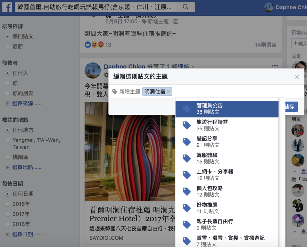 方法一:在管理員介面,進入「管理社團」,點「貼文主題」,按「建立主題」,設定新主題,畫面中的主題是 Daphne 為自家韓國社團設定的主題標籤。