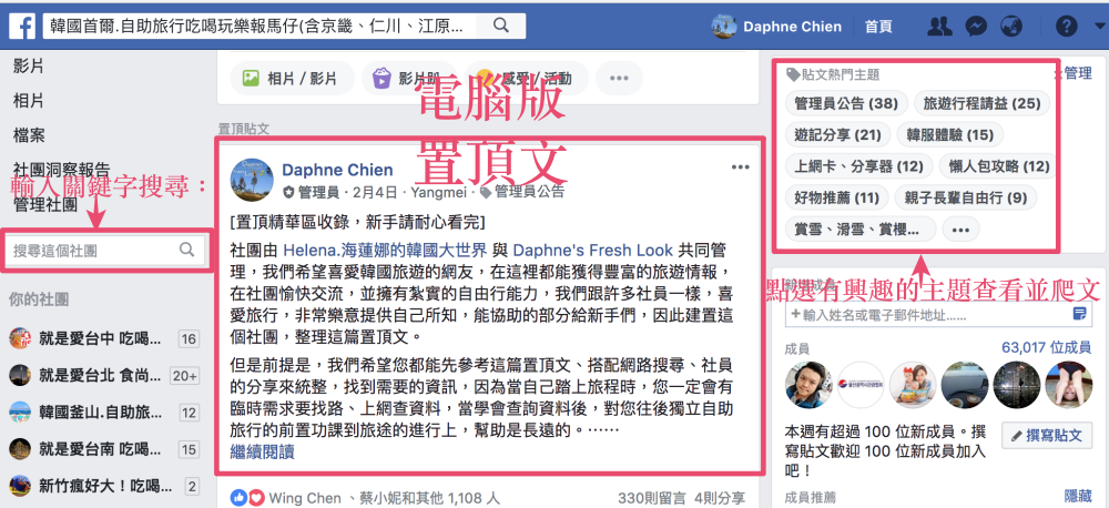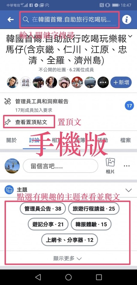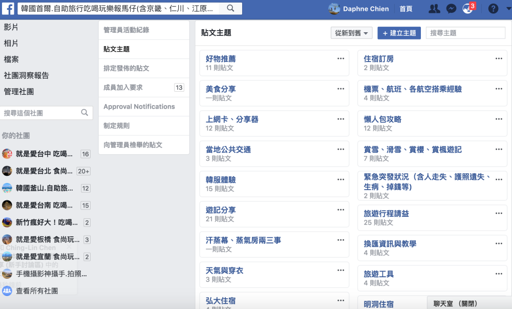 想要訓練自己的 EQ、公關、社交能力,經營一個 FB 旅遊社團準沒錯!因為會在短時間內接觸許多不同觀念與價值觀的人,有如服務業一樣,想法很天、個性如奧客的人通通會遇到,身為社團版主,需要有智慧、反應去化解大大小小的紛爭,經營上困難又複雜的程度,不比上班輕鬆。就以FB旅遊社團的經營,想要經營得好,時常觀測社團討論風向,整理出網友想看的資料是基本。雖然FB社團早有搜尋功能,盡責一點的版主也主動整理置頂文,可是不看的人(也有可能不知在哪看)不在少數,因而丟了一個社團可搜尋,也可以問到Google大神的問題出來,導致紛爭的情況很常見,也許FB自己有注意到這問題,貼心地為版主們增加了「自訂討論主題」功能,讓社團成員在首頁,即可快速索引主題,迅速找到討論串,進而爬文。