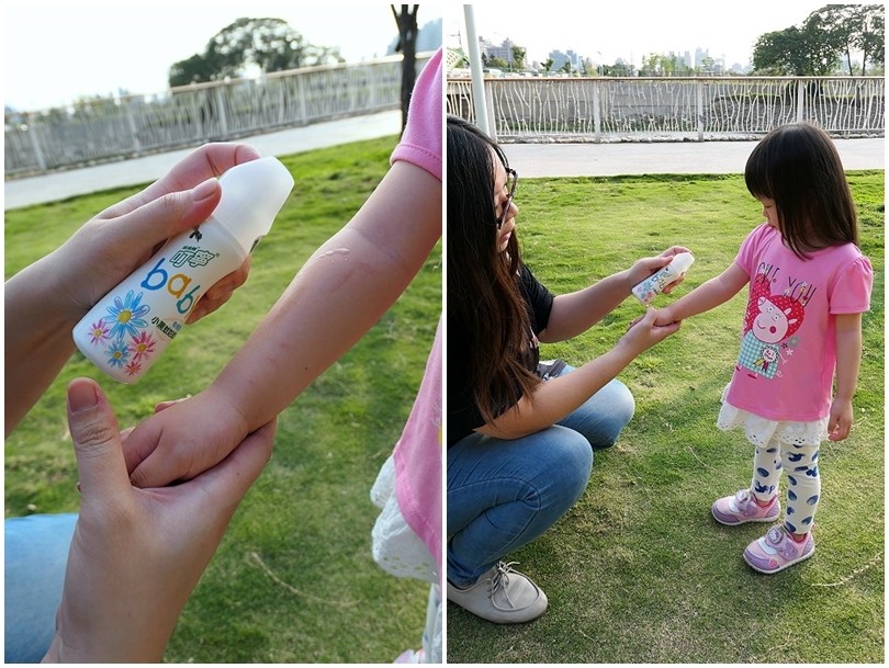 ▼小口愛也要來補噴一下,拿出叮寧寶貝有機精油小黑蚊防蚊液噴在手上再塗抹均勻後就沒問題啦!