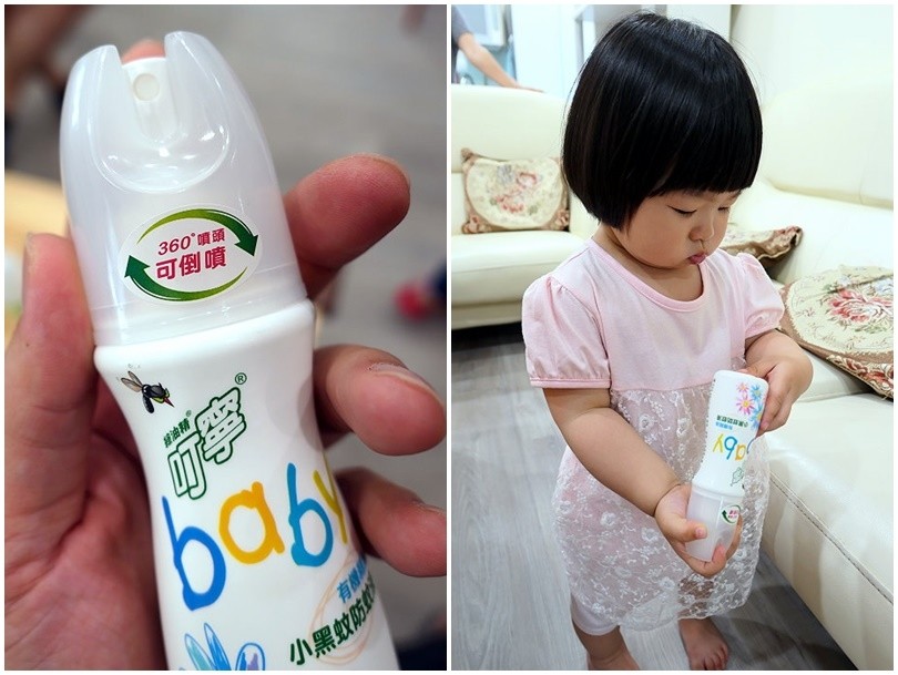 ▼這款小黑蚊防蚊液有特殊專利設計的瓶蓋,跟瓶身連在一起,外出時也不用擔心蓋子會不見,放在包包裡也不會壓到噴頭,對於帶小小孩出門的爸媽來說真的很方便!且還使用360度可倒噴的專利噴頭,不管是噴手噴腳或是任何角度都方便順手!小口妹還好奇的東看西看,感覺很有興趣XD
