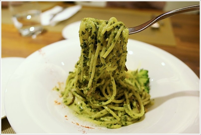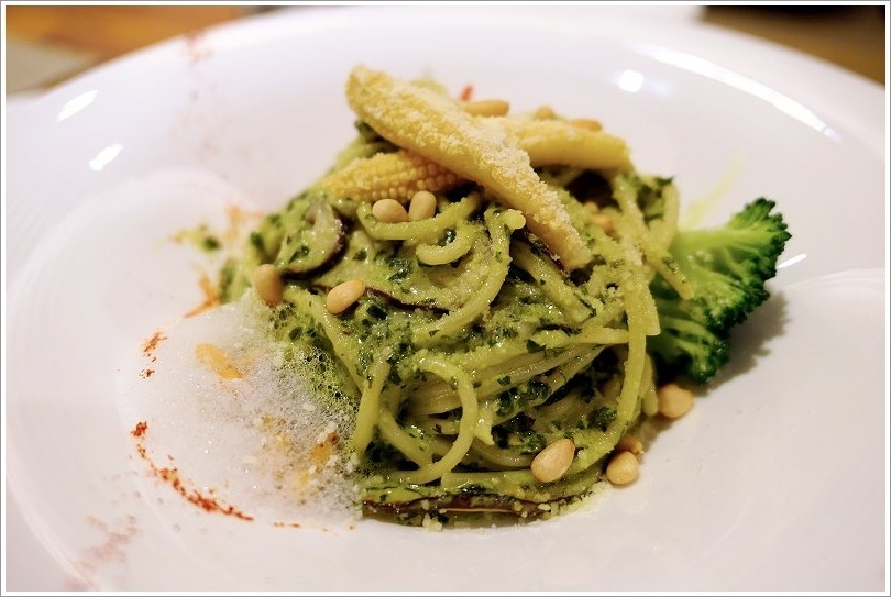 ▼松子青醬義大利麵,醬料收得較乾一些,採用的是絞碎的羅勒葉,彷彿還吃得到些微羅勒的口感!吃起來香氣十足,搭配松子、蔬菜層次頗為多元!