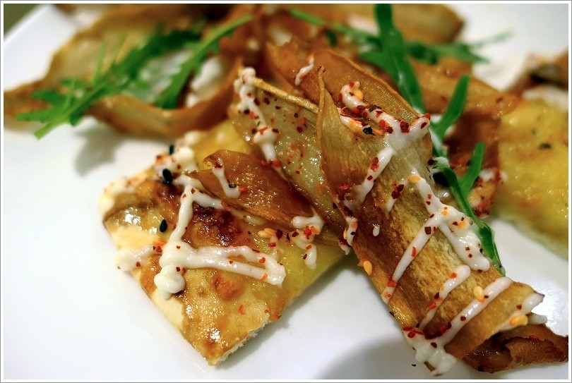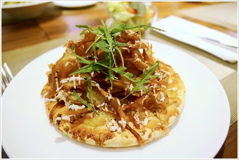 ▼上頭的杏菇切得非常輕薄細膩,先炸後烤、搭配醬料更為軟Q香甜,加上帶點厚度的餅皮更是有嚼感,深受大小朋友的喜愛!