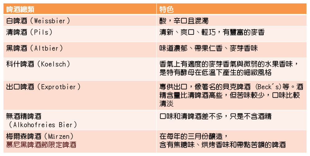 說到啤酒的種類很多,黑啤酒是德國男人最常喝的啤酒,而檸檬啤酒是很多女生和觀光客喜愛。每個地方都有自己釀的品牌,因為運送會產生污染,因此他們很在乎在地釀造,也因此造就了許多各地風味的啤酒,是嚴謹的德國人歡樂放鬆時刻的好夥伴。