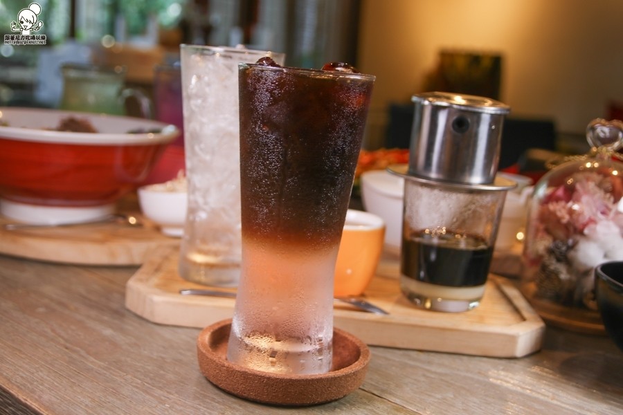 使用越南咖啡獨家調配的越南情緣,底下透明是玫瑰露,在搭配檸檬