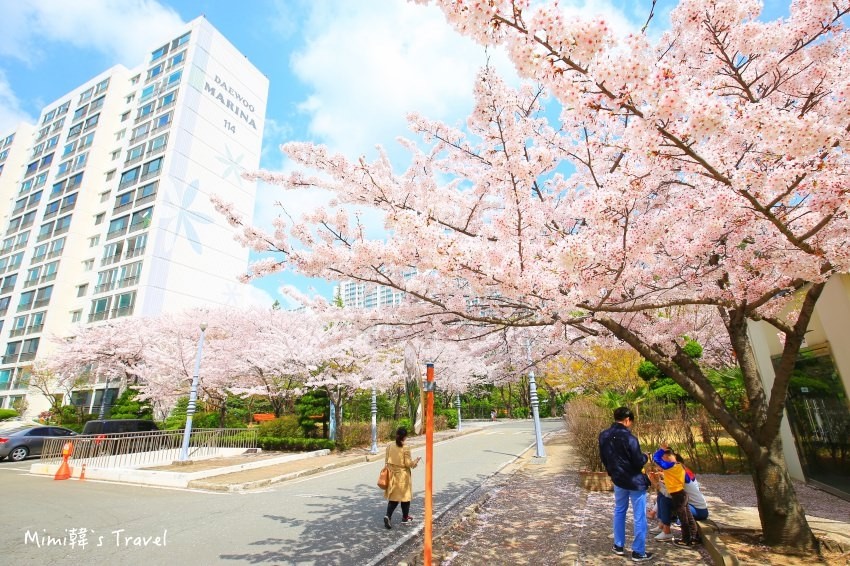而且這裡又距離釜山的海雲台相當近,是很可以放在一起順遊賞櫻的地方,從冬柏站下車走出來,旁邊就都是滿滿的冬柏站櫻花路美景,搭配不遠處的海雲台大廈群,城市景觀與櫻花互相輝映,超美的。而且因為是住宅區,上班時間幾乎沒啥車輛,愛怎麼拍就怎麼拍 ?
