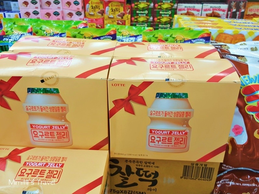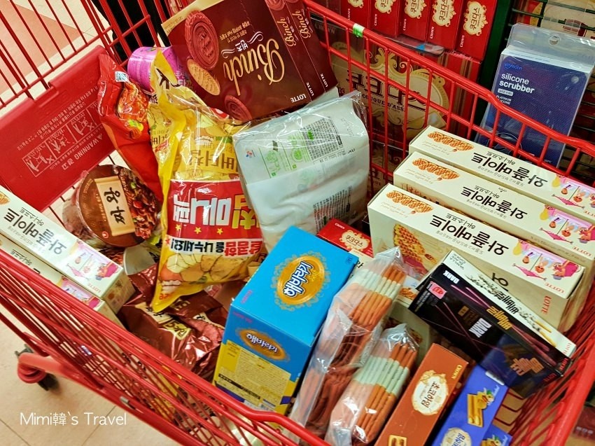 別的不說,來樂天超市掃貨的朋友大概80%都集中在這零食區,現場餅乾糖果都是堆滿滿,有小盒包裝可以買,也有組合包裝比較便宜。大家都是推著手推車瘋狂掃貨,幾乎每一台都是堆到滿出來,比較誇張的是看到3位應該也是台灣來的遊客,1人推1台全裝滿,好像東西不用錢一樣,超厲害。