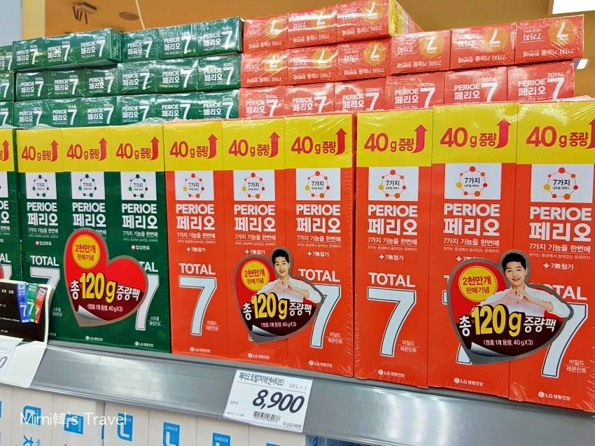 宋太太們必買,由宋仲基代言的LG Perioe 倍麗兒 7效牙膏,強調超強抗菌功能、7倍清爽感。藍色包裝一般使用、綠色包裝是加強保健,而紅色包裝敏感牙齒專用。