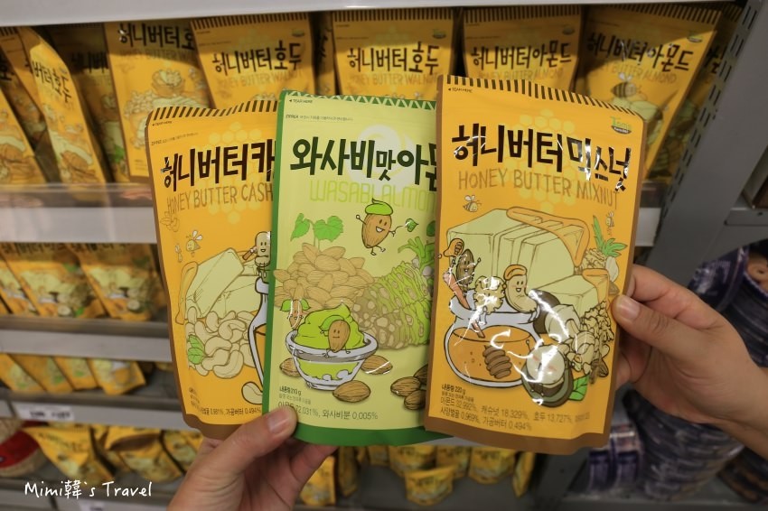 韓國必買的零食中,Honey Butter系列堅果一直是很多人推薦的必掃的目標,Mimi自己最喜歡的是黃色包裝的蜂蜜奶油,另外還有哇沙比、大蒜等口味。也提醒大家,它還有分成杏仁果、腰果,綜合堅果等包裝,買的時候記得注意看一下包裝上的圖案。