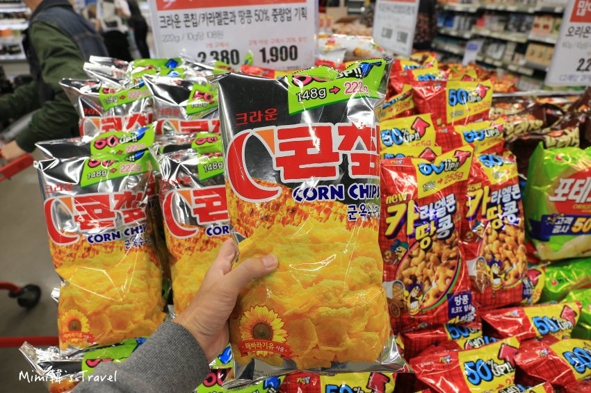 這個콘칲(Corn Chips)玉米片上面灑了很多鹹鹹甜甜的粉,吃起來很香脆刷嘴,我一開始是看朋友說這個餅乾很好吃,就買來試試,果真不錯唷!而且超大一包才2380韓元,推薦!