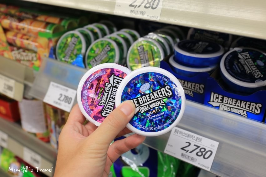 韓國很受歡迎的薄荷涼糖,架上有滿多口味,有草莓、西瓜檸檬、覆盆子、西瓜、薄荷等選擇,台灣雖然也買得到,但價格當然是韓國買便宜很多啦!掃幾盒回家慢慢吃,酸酸甜甜又能讓口氣變好,滿多女生很愛。