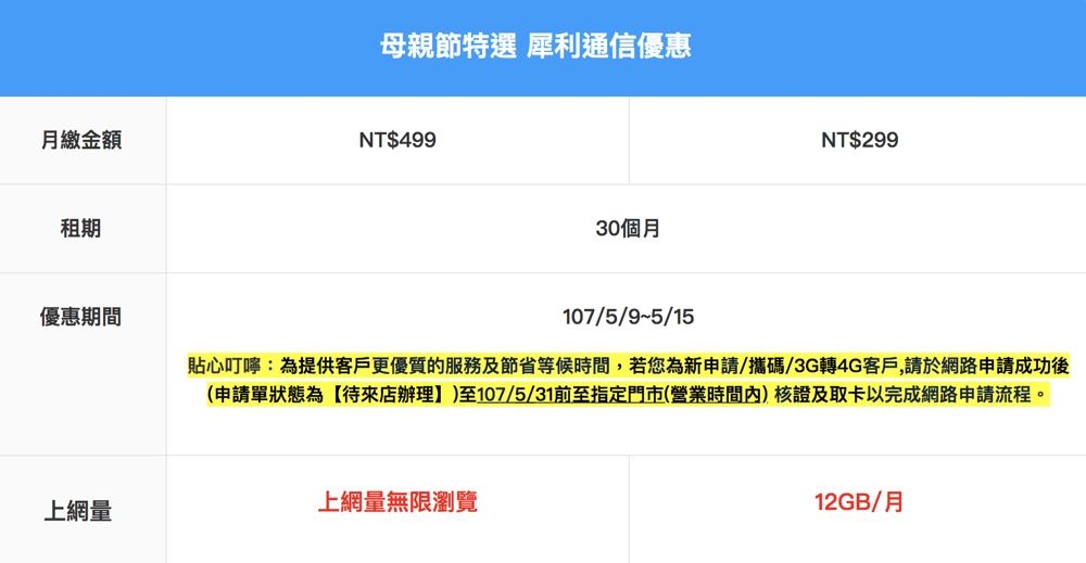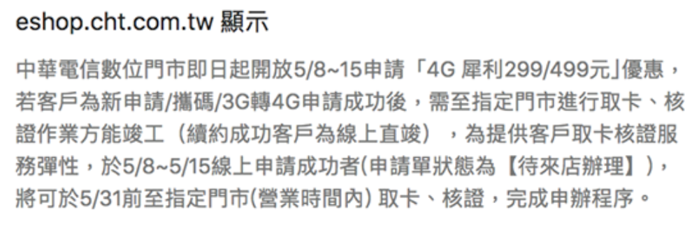 就在稍早中華電信特別於官網宣布:「中華電信數位門市即日起開放 5/8~15 申請 4G 犀利 299 / 499 元優惠,若客戶為新申請 / 攜碼 / 3G 轉 4G 申請成功後,需至指定門市進行取卡、核證作業方能竣工 (續約成功客戶為線上直竣),為提供客戶取卡核證服務彈性,於 5/8~5/15 線上申請成功者 (申請單狀態為【待來店辦理】),將可於 5/31 前至指定門市 (營業時間內) 取卡、核證,完成申辦程序。」