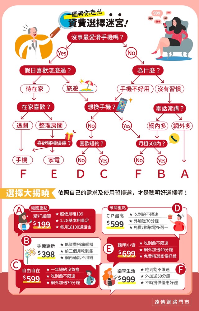 在萬物皆漲唯有薪水不漲的年代中,精打細算的將每個月所得花在刀口上,成了現代人面臨未來如何生活下去的重要課題之一。而為了幫助現代人以最經濟實惠的價錢,滿足在通訊、生活、社群、娛樂…等各方面的需求, 遠傳網路門市 特別推出「 遠傳網路門市限定資費系列」方案,共有 $199、$398、$599、$699 以及 $999 五種不同電信資費可選,每一方案都有針對通話費及網路用量給出對應的優惠,讓消費者可以依照使用需求或是預算考量,選擇最適合自己的方案。