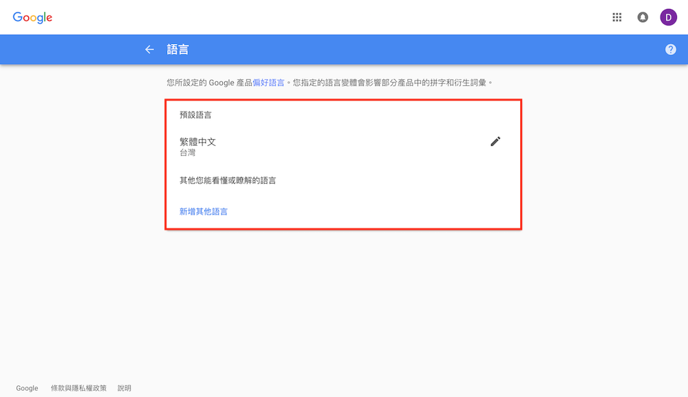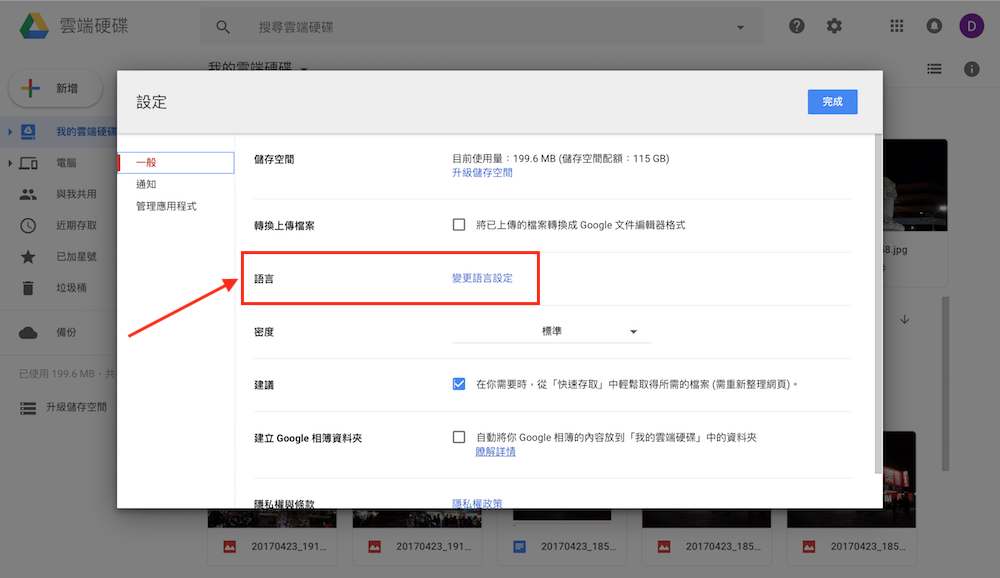 進入設定頁面後,請直接點擊語言選項中的「變更語言設定」,接著 Google Drive 就會開啟另一個頁面,讓使用者直接調整顯示語言,待設定完畢之後即可以所選語言顯示。