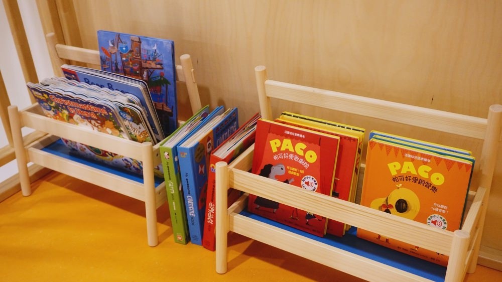 另外我非常喜歡他們的閱讀區,要走上樓梯,有小小的閱讀空間,書架上擺的是我的夢幻逸品「帕可好愛」系列音樂書,帕可好愛系列的書是「法國音樂繪本」有聲書。每一頁裡面都有主題音樂,可以一邊唸裡面的故事,然後按下聲音播放,質感很好!