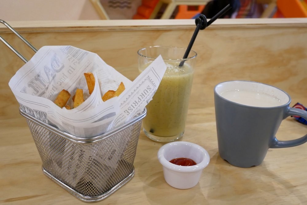 提供輕食、甜點、炸物、飲料,食物選擇不多,但份量頗大,比較建議大家可以先吃飽再去玩,或是當下午茶點心享用。