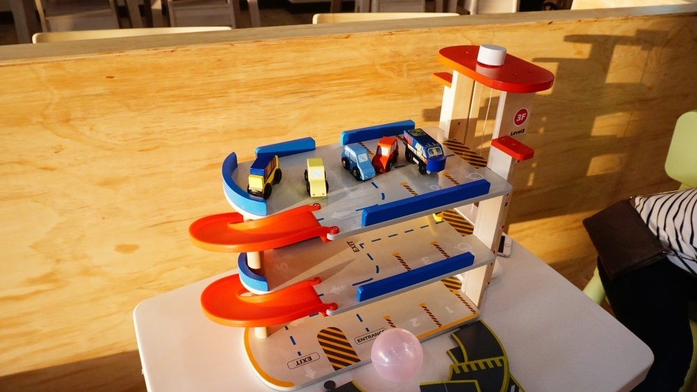 玩耍的空間比起其他的親子餐廳來說的確小很多,但我覺得已經足夠了。麻雀雖小,五臟俱全!該有的廚具組、賽車組、積木、益智玩具、拼圖、音樂玩具、球池、溜滑梯、童書閱讀區都應有盡有。