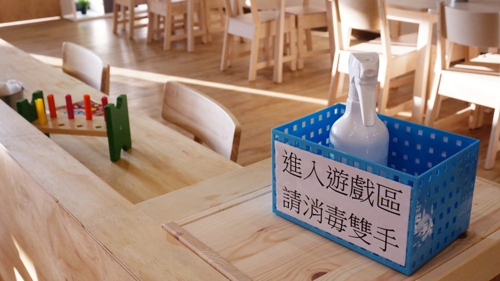 進去遊戲區之前要先消毒雙手,大人小孩都要。