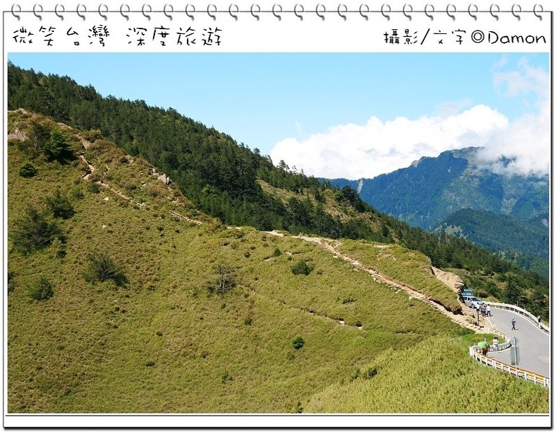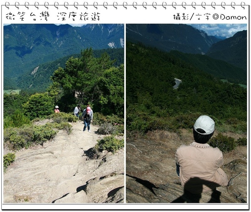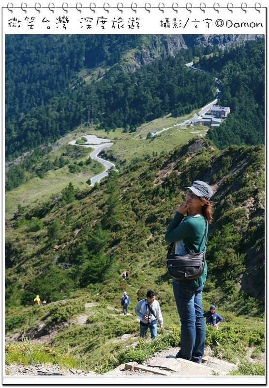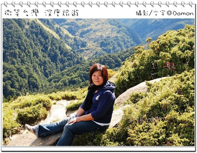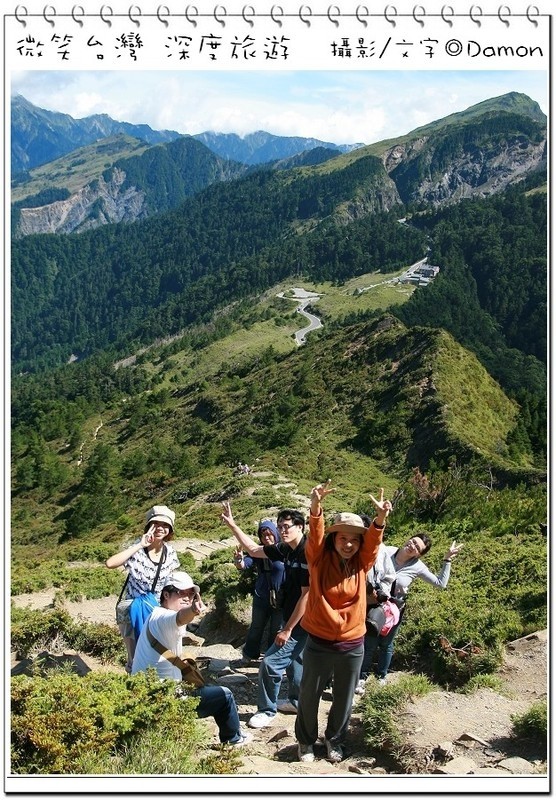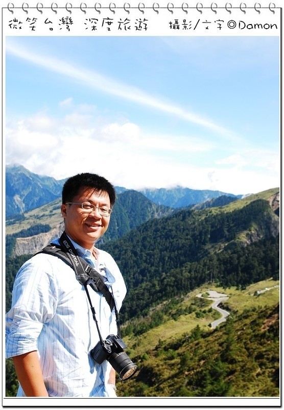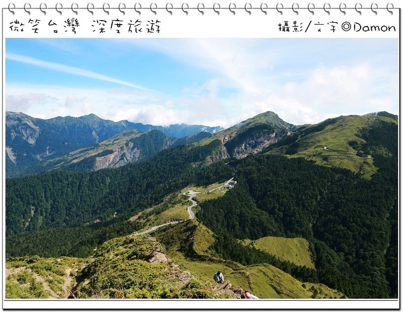 ▲好不容易麒欽終於拿出他的單眼幫我拍一張囉,下方蜿蜒的合歡公路是我們的登山口,一路的攀登好辛苦,但是看到這美景好值得。