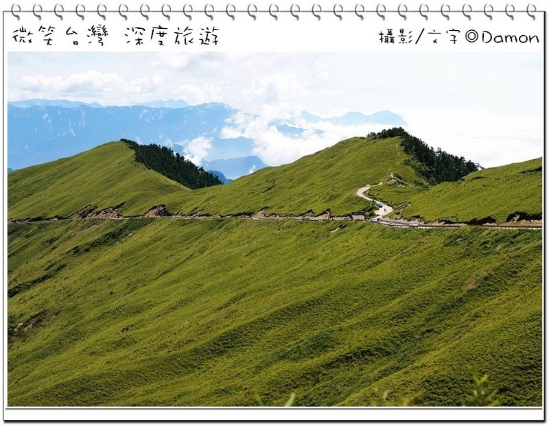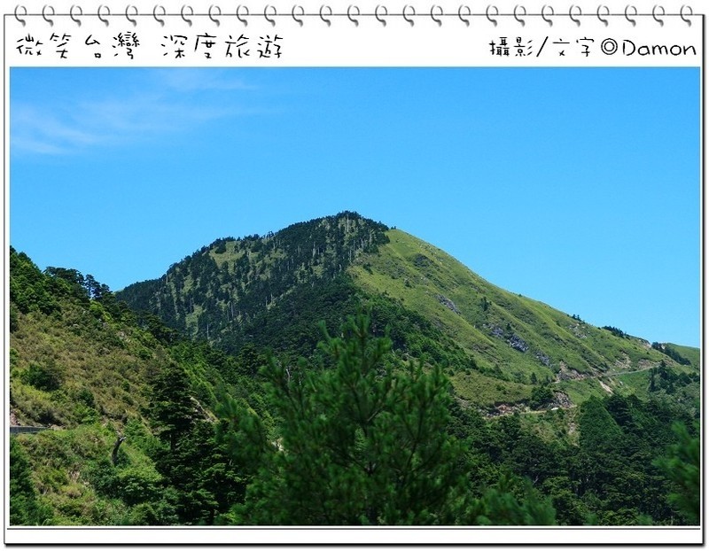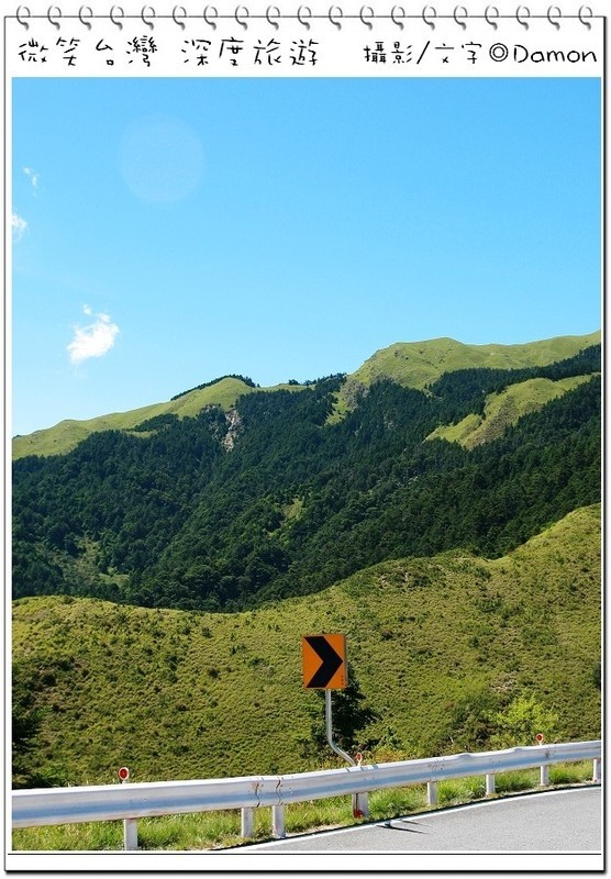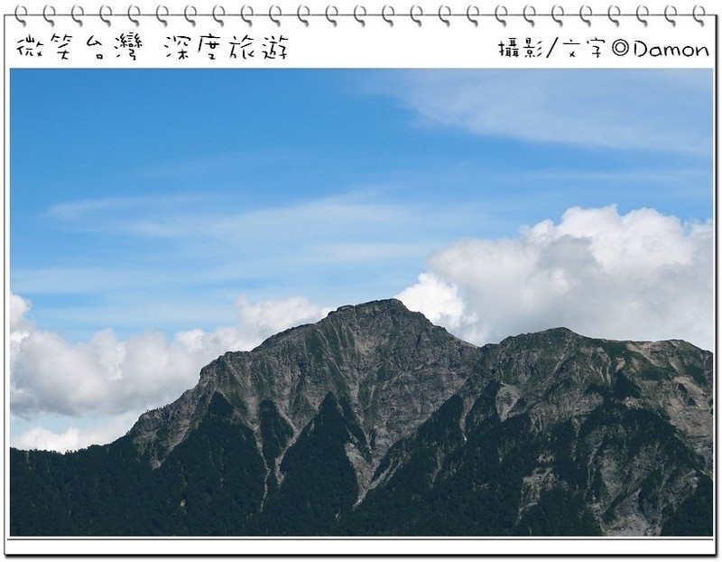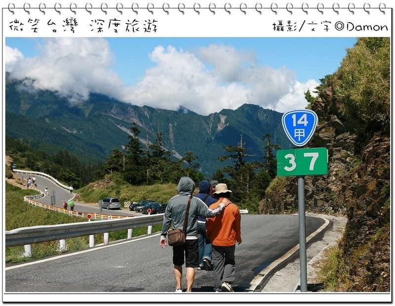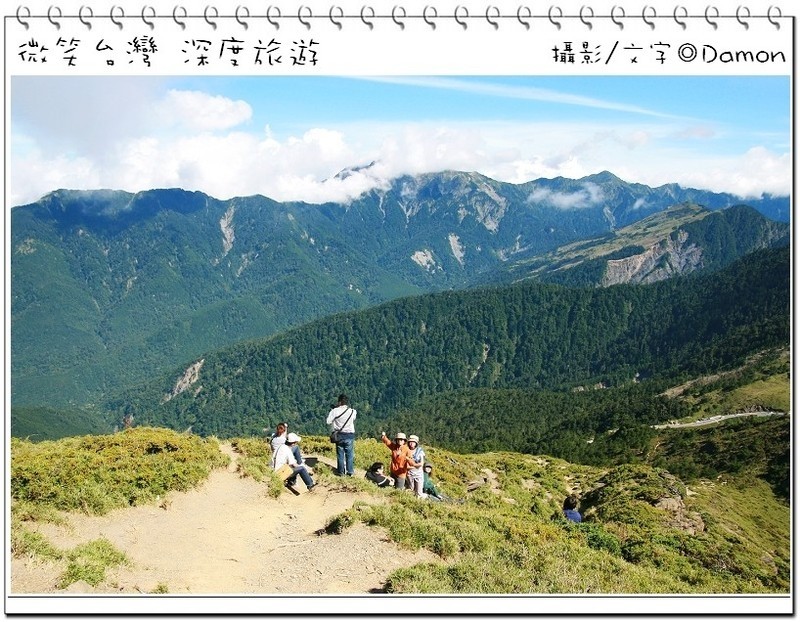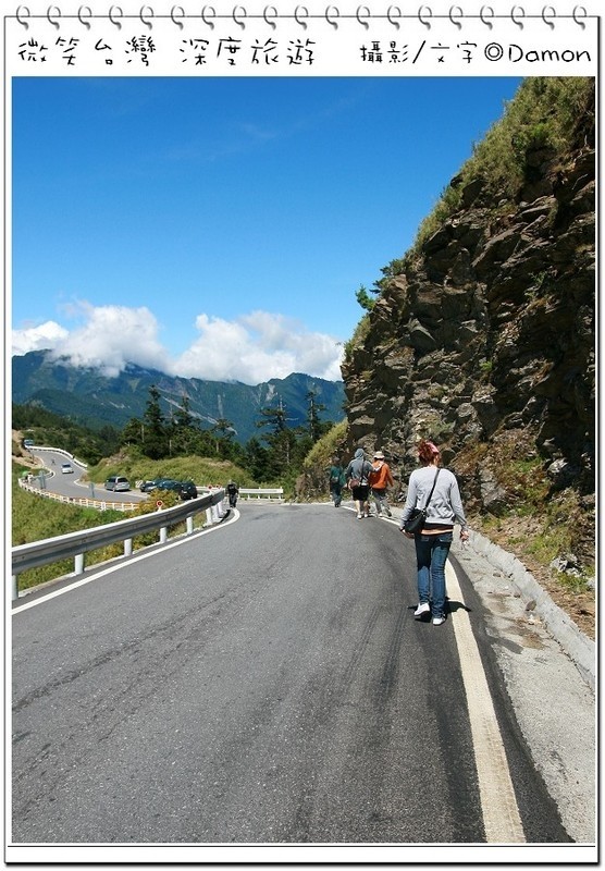 ▲好不容易麒欽終於拿出他的單眼幫我拍一張囉,下方蜿蜒的合歡公路是我們的登山口,一路的攀登好辛苦,但是看到這美景好值得。