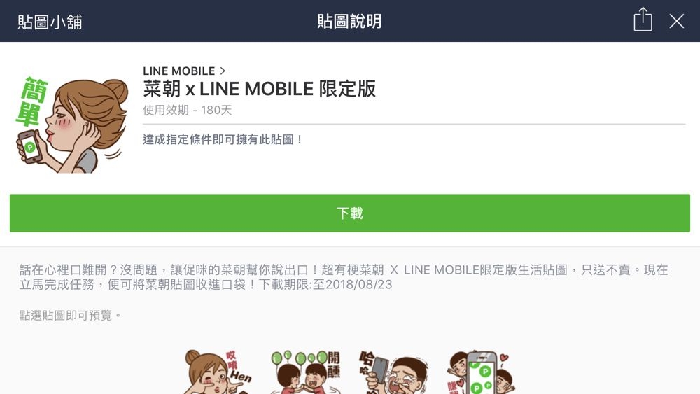 Step1:活動期間完成任務(以 LINE MOBILE 門號於官方帳號中綁定)即可免費下載用戶專屬貼圖