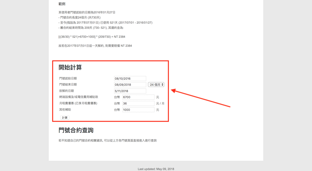 在「門號解約機計算機」的頁面中,除了說明如何計算、範例之外,下方設有可讓使用者輸入門號租約資訊的欄位,只要在「開始計算」的欄位中輸入門號起始日期、門號結束日期、欲解約日期、終端設備及 / 或電信費用補貼款、月租費優惠 (已享月租費優惠) 以及其他補助,就能開始計算目前租約提前解約的話還要給付多少解約金給電信業者,讓想換約申辦中華電信 499 上網吃到飽方案的朋友心中有個底。