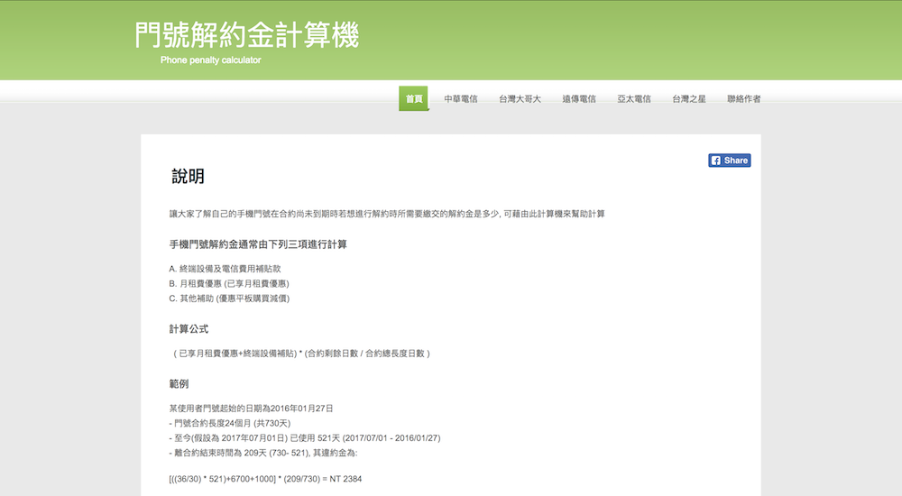 最近「中華電信 499 上網吃到飽方案」持續延燒,全台各地中華電信門市也滿滿都是申辦人潮,對於門號租約已經到期的民眾來說,申辦較便宜方案可以省下不少月租費,但對於門號租月尚未到期,或是最近才剛申辦高額方案的朋友囉說,若要解除合約並轉入中華電信 499 上網吃到飽方案,可是要負擔一筆解約金。為了讓所有想要提早解除合約的朋友試算目前要繳付的解約金額,網路上出現了一個「門號解約金計算機」只要將目前租用的方案資訊輸入,即可快速計算要繳付的解約金額,讓打算換約的自己心中有個底。