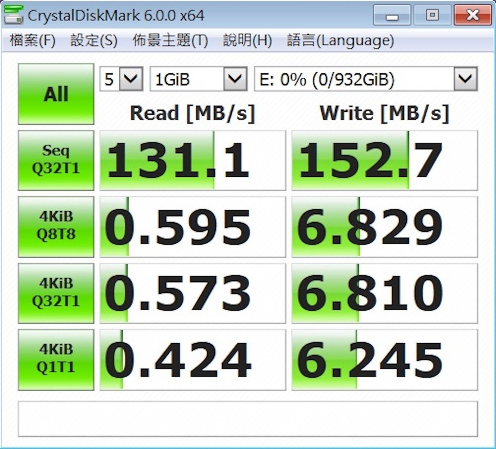 經過我們使用硬碟讀寫速度測試工具 CrystalDiskMark 6.0.0 版本的實測,配備 5,400 轉 2.5 吋硬碟、高達 5Gbps 傳輸速度 USB 3.0 連接埠的 TOSHIBA Canvio Premium (P2),它的讀寫成績表現相當出色,循環讀取的速度達 131.1 MB/s,而循環寫入速度則是達 152.7 MB/s,即使要存取較大容量的檔案,也能在相當短的時間內完成。