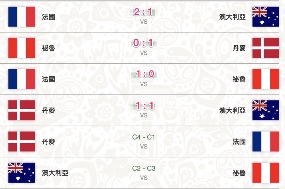 2018 年世界盃足球賽將於 2018 年 6 月 14 日至 7 月 15 日在俄羅斯舉行,共有 32 支球隊,分成八組分組對戰,這次在 C 組中,共有法國、秘魯、丹麥、澳洲進行對戰,