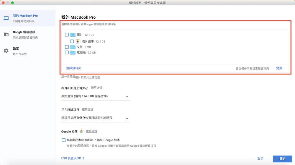 進入偏好設定之後,請直接在「我的 MacBook Pro」欄位中的圖片、文件、電腦版三個資料夾取消勾選,接著再點選右下角的「確定」,完成整個取消 Google Drive 自動備份檔案的設定流程。