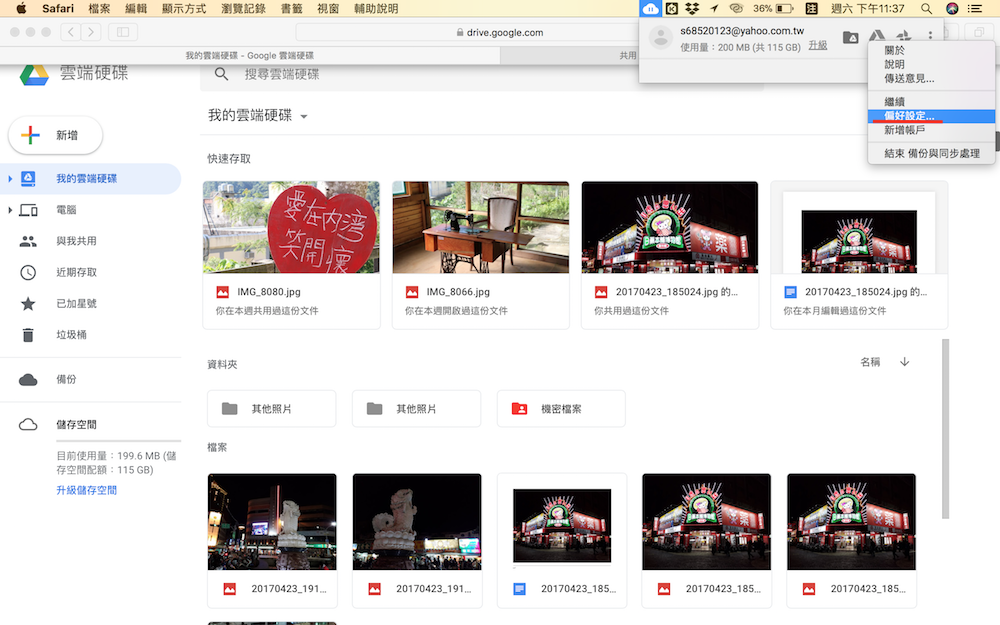 要將 Google Drive 應用程式自動備份功能關閉,首先請打開雲端硬碟應用程式的快捷列,接著點選「偏好設定」,即可進入應用程式的設定頁面。