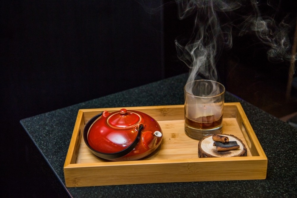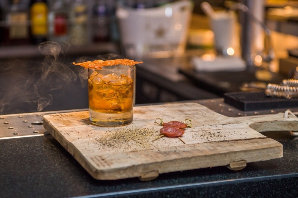 「b.b.q.」:你也從沒想過台灣香腸也能製作調酒吧?!「b.b.q.」為一款威士忌為基底的酒,在調製的過程中,調酒師會運用噴槍燒炙的方式,讓台式香腸與洋甘菊茶包醃燻後的味道遺留在杯子與器皿當中,讓還沒品嚐到此杯調酒的客人在嗅覺上就能先得到大大的滿足,並加深對此款調酒的印象,此種方式也讓客人在口感上有了多重層次的享受!