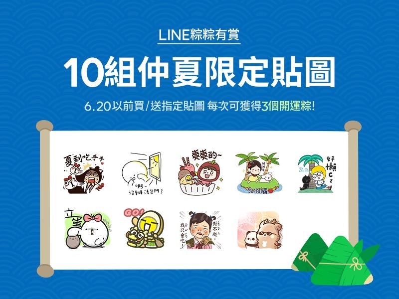 端午不划龍舟來滑貼圖!10 組仲夏限定貼圖重磅聚集台灣與國際人氣角色,包括迪士尼的史迪奇、武林中二、婉君、草莓妹、黑白雞、寶寶不說、SweetHouse、米滷蛋、小學課本的逆襲、黑桃 A 喜等,用這些應景的貼圖來慶端午,讓端午佳節增添新的祝賀趣味!10 組仲夏限定貼圖將販售至 2018 年 6 月 27 日為止,但在 6 月 20 日 23:59 前購買,每買或贈送朋友一組貼圖,購買者就能獲得 3 個開運粽,可以自己開啟開運粽抽 LINE Points,也可贈送給親友,趕緊號召親友一起入手這 10 組仲夏貼圖!