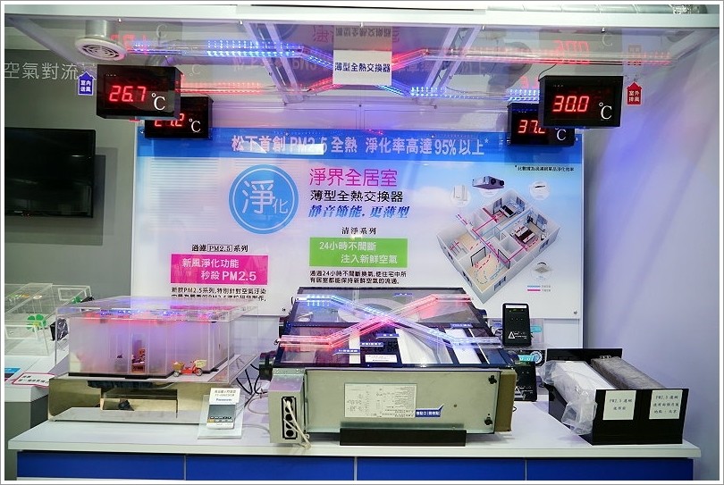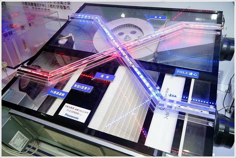 ▼這是實體機器的內部構造,右下角就是將室外空氣導入,如此比對上圖的相對位置,將室外33.2度導入室內的同時經過全熱交換器,與室內即將排出室外的26度空氣進行熱交換,就能夠成功將33.2的室外溫度降低為28.8度,這時候室內的空調也能夠更節能。