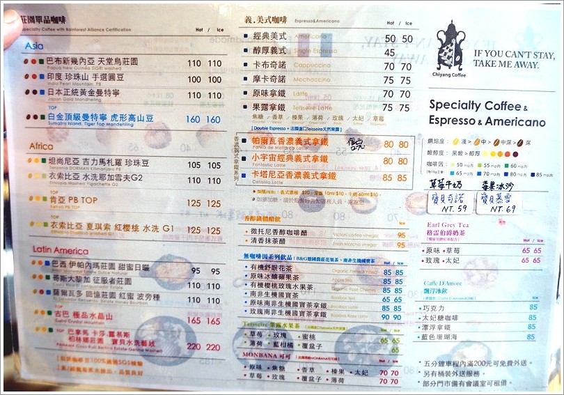 ▼另一面則是有單品咖啡、義式&美式咖啡、醋飲、水果茶、無咖啡因系列飲品、可可、漂浮冰飲等,選擇還不少!貼心的是咖啡還有特別標示烘焙度、濃醇度及咖啡因含量,大家都可以參考點餐!