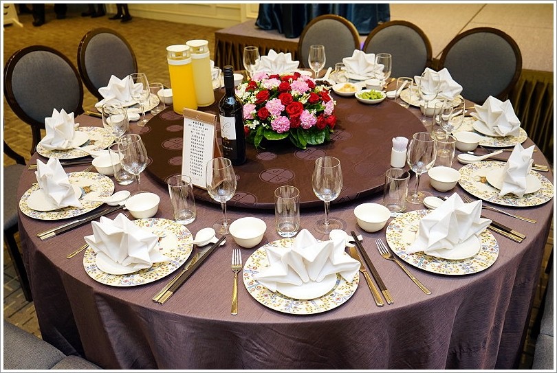 ▼這裡的桌巾顏色都可以任選,一共有四種顏色,都可以隨新人喜愛來挑選搭配!椅子也不像一般婚宴會館有套上椅套,而是走原木風格,既典雅又舒適,整體感覺相當大器!
