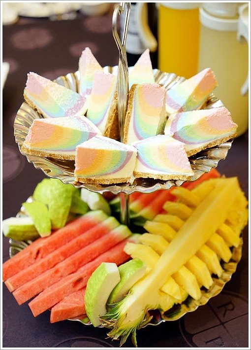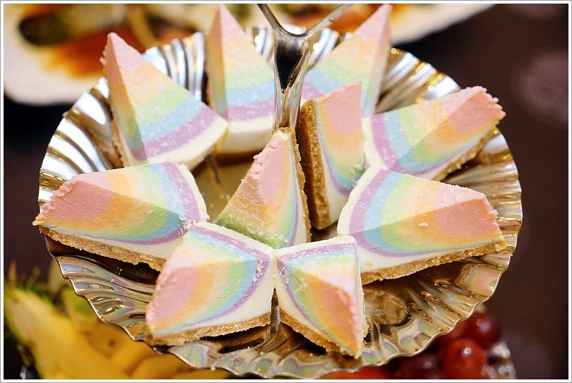 ▼最厲害的莫過於他們家的甜點、水果啦!甜點特別與中壢知名的網紅蛋糕店Piepai Cafe'(派派咖啡)合作,也就是鎮店之寶彩虹生乳酪蛋糕,這款人氣超夯,沒預訂可是吃不到,沒想到在喜宴的結尾還能吃到這麼美味的蛋糕,真是好享受啊!