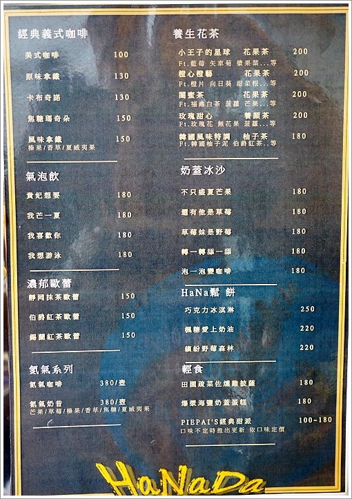 ▼MENU,除了有提供義式咖啡之外,也有氣泡飲、歐蕾、花茶、奶蓋冰沙、鬆餅、輕食等,很適合來這裡吃個下午茶聊聊天也不賴!