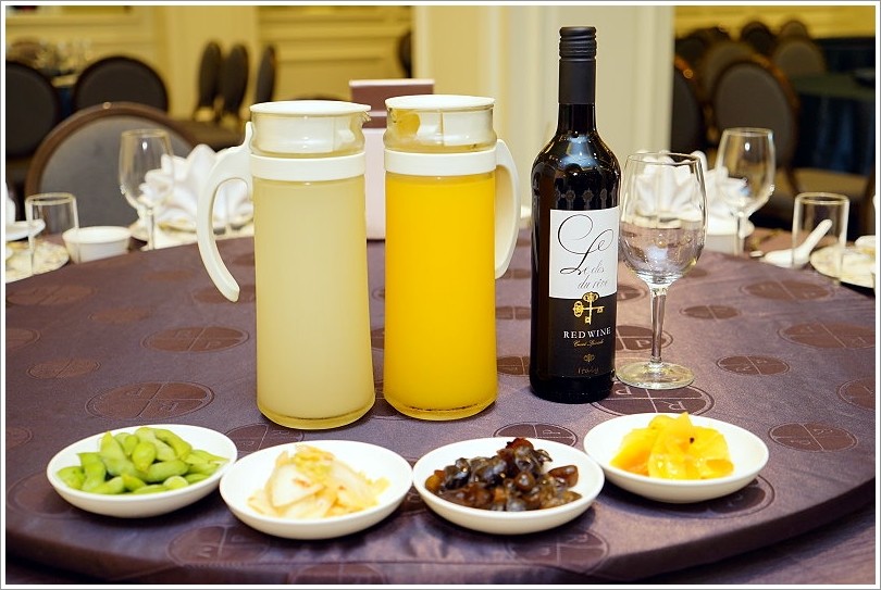 ▼每桌還會附上四道小菜、果汁無限暢飲及紅酒一瓶,算是面子、裡子都有啦!
