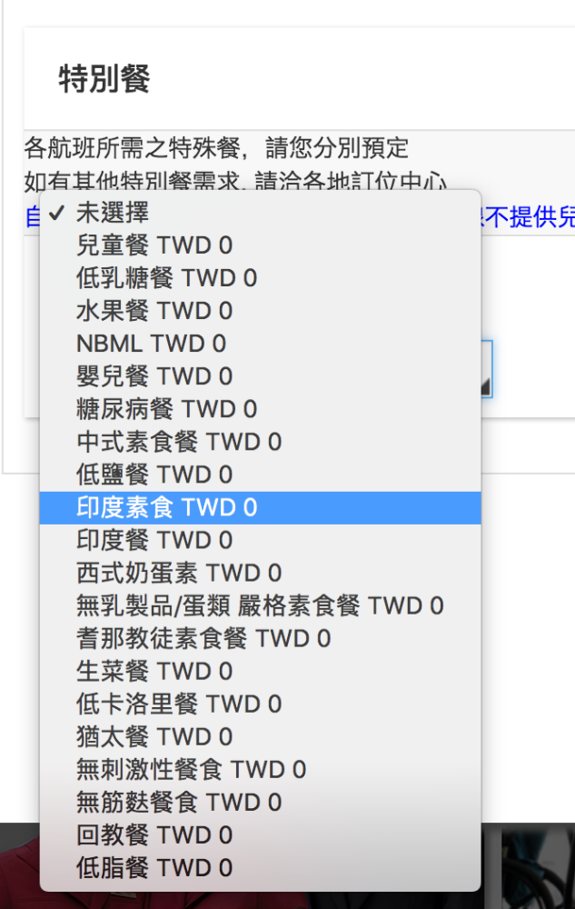 爆肝實在太無聊,人家信件來只是要爆肝可以先上去選位,結果選擇完廁所第一排的走道位置之後,實在太無聊,順便看看「預定特別餐」到底有什麼,意外的發現可以選的也太多了吧!