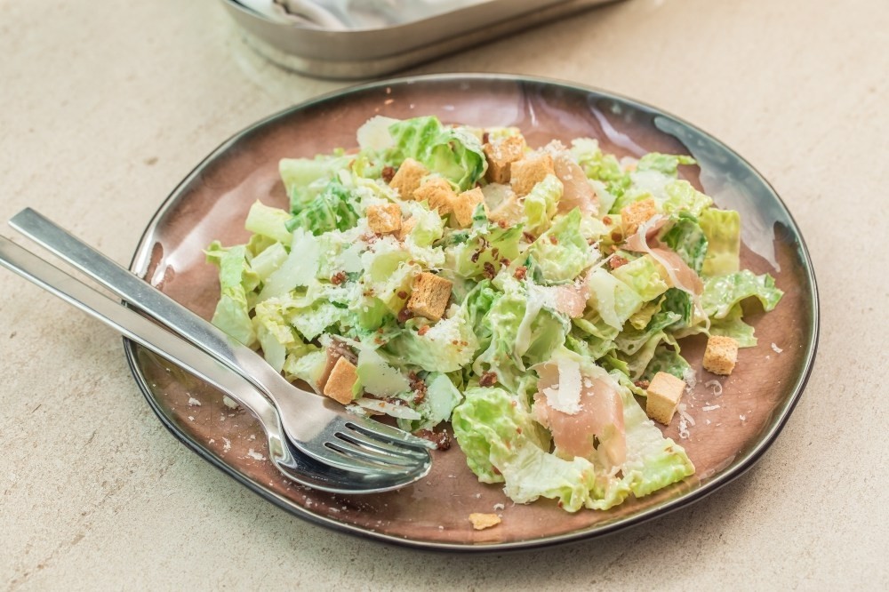 口感厚實濃郁的傳統凱撒沙拉,吃起來豐富度十足,麵包丁與生菜表現出很不錯的嚼感,凱薩醬汁與火腿則是讓味道變得更有層次