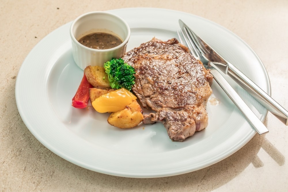 主菜部分包括爐烤美國肋眼牛排12oz 或美式碳烤豬肋排,搭配香蒜麵包與傳統凱薩沙拉,以及義式番茄蔬菜湯跟松露薯條