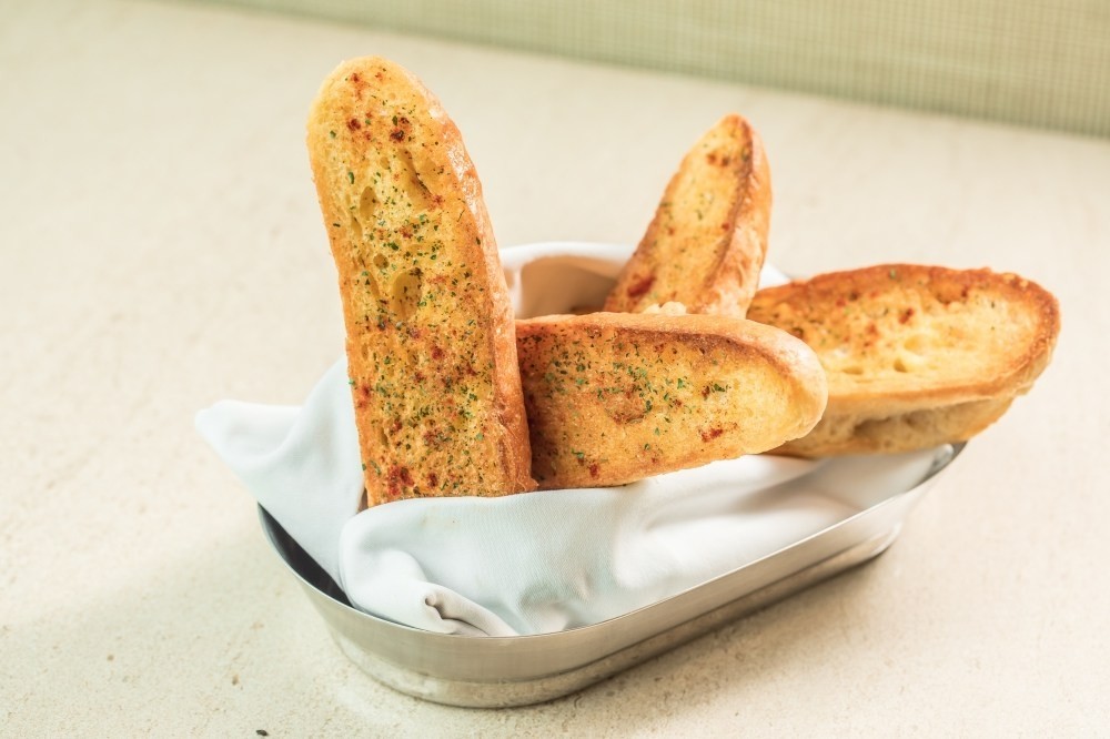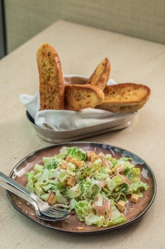 首先上桌的,就是香蒜麵包跟傳統凱撒沙拉。(搭配份量都是以四人份為主)