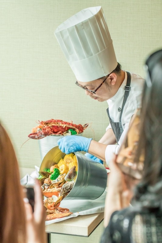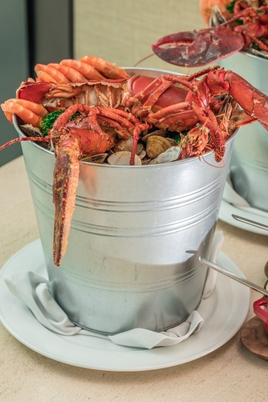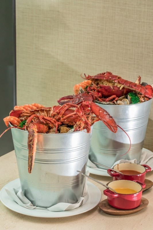 既然名為海鮮桶,當然就是各種好料海鮮當主角,除了水煮來自加拿大(重約650公克)的波士頓活龍蝦之外,搭配淡菜、大草蝦、蛤蜊、螃蟹、生蠔、小章魚等海鮮(會依照時令季節略微調整),表現出兼具口感與鮮度的最佳組合。