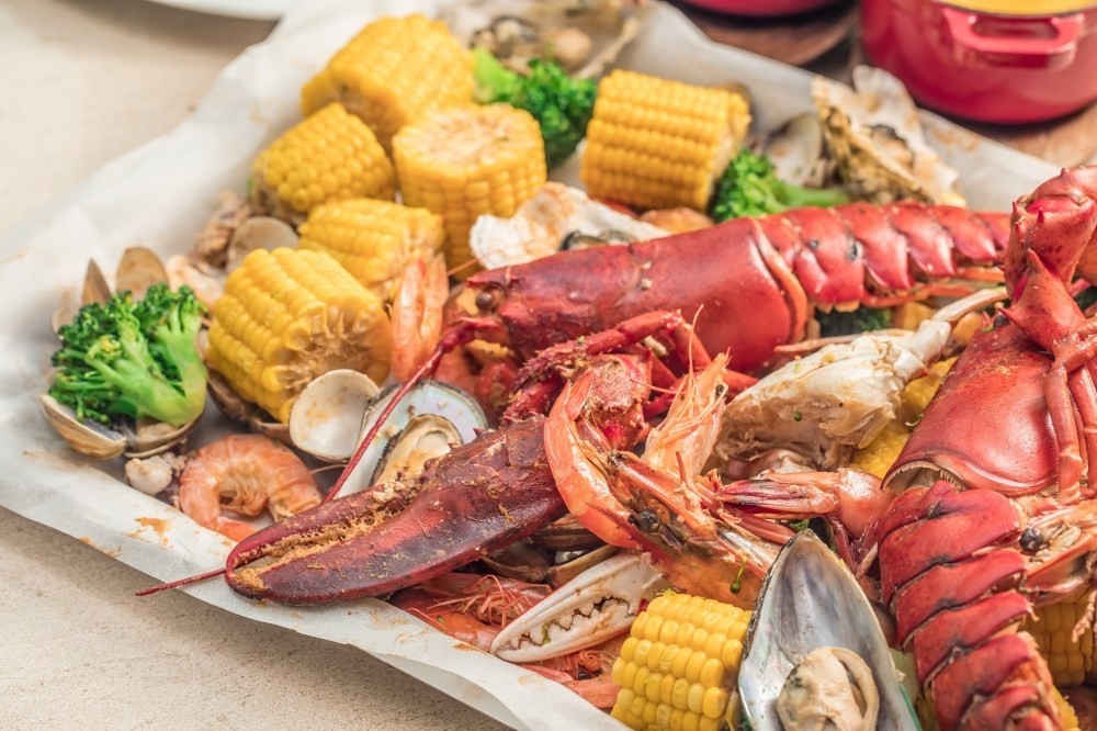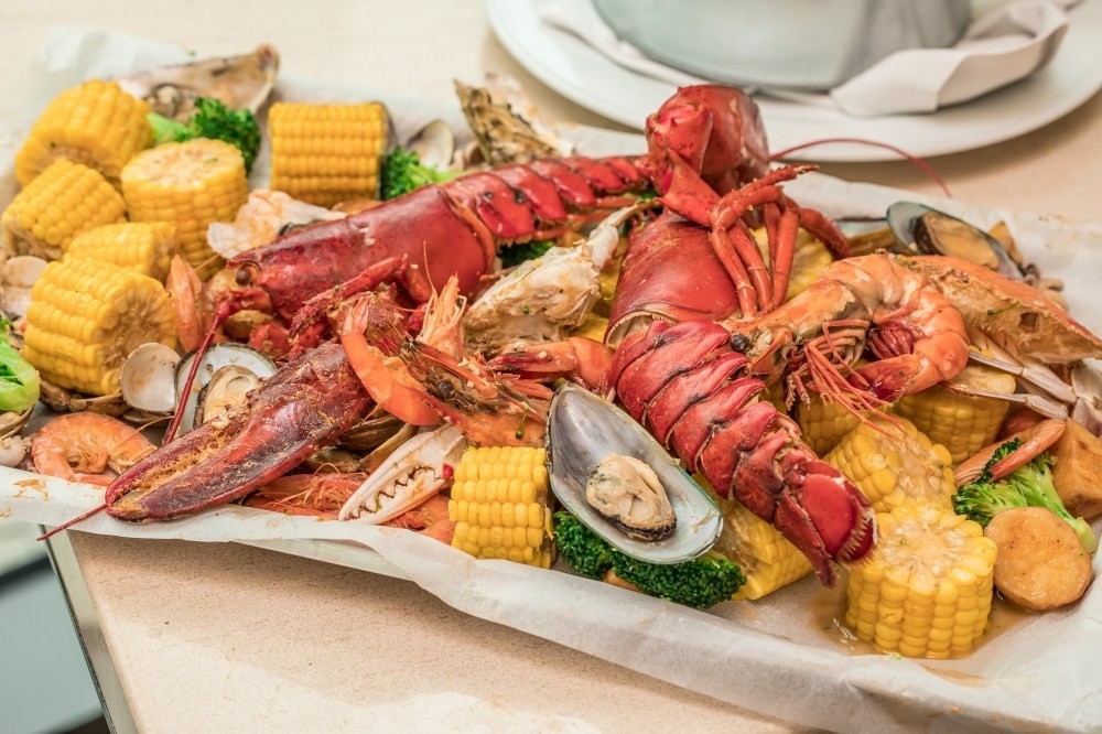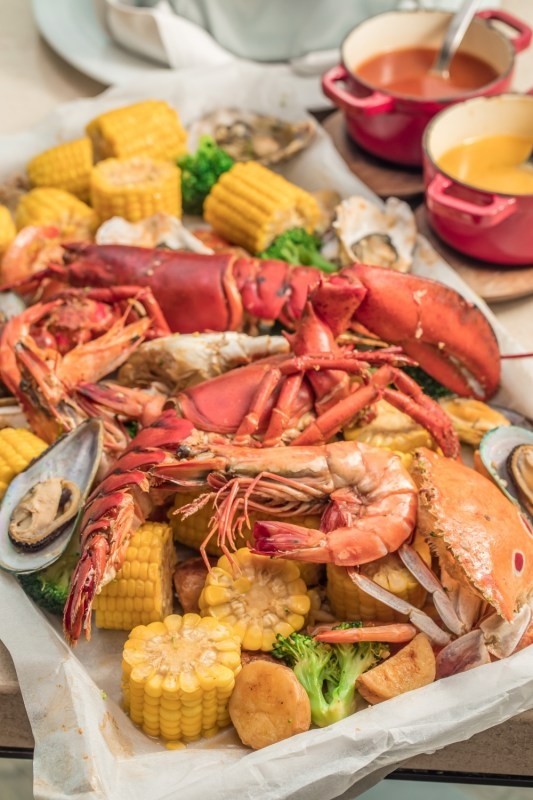 舊金山海鮮桶內容包括波士頓活龍蝦/大草蝦/淡菜/螃蟹/蝦子/蛤蜊/生蠔/小章魚/紅皮洋芋/玉米/花椰菜