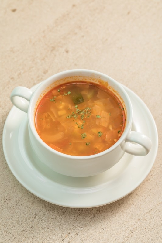 搭配清爽微酸的義式蕃茄蔬菜湯,正好能轉換肉類主食的厚實口感。