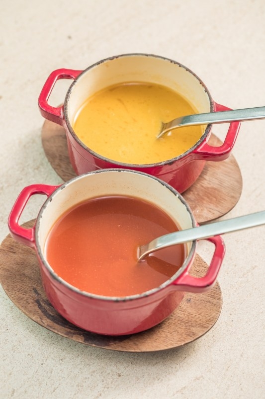 品嚐完這幾道海鮮桶組合的肉類主食與配菜之外,服務人員也送上舊金山辣醬與蒜味檸檬海鮮醬這兩碗醬料。